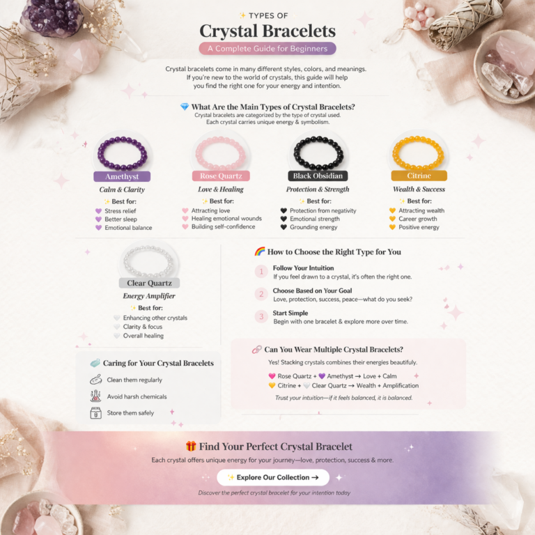 Crystal bracelets come in many different styles, colors, and meanings. If you’re new to the world of crystals, choosing the right one can feel overwhelming. In this guide, we’ll break down the most popular types of crystal bracelets so you…